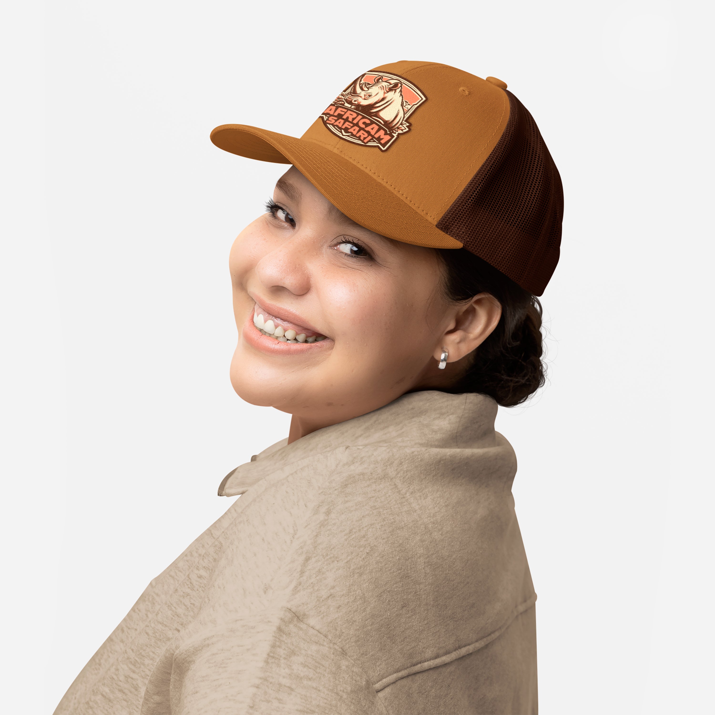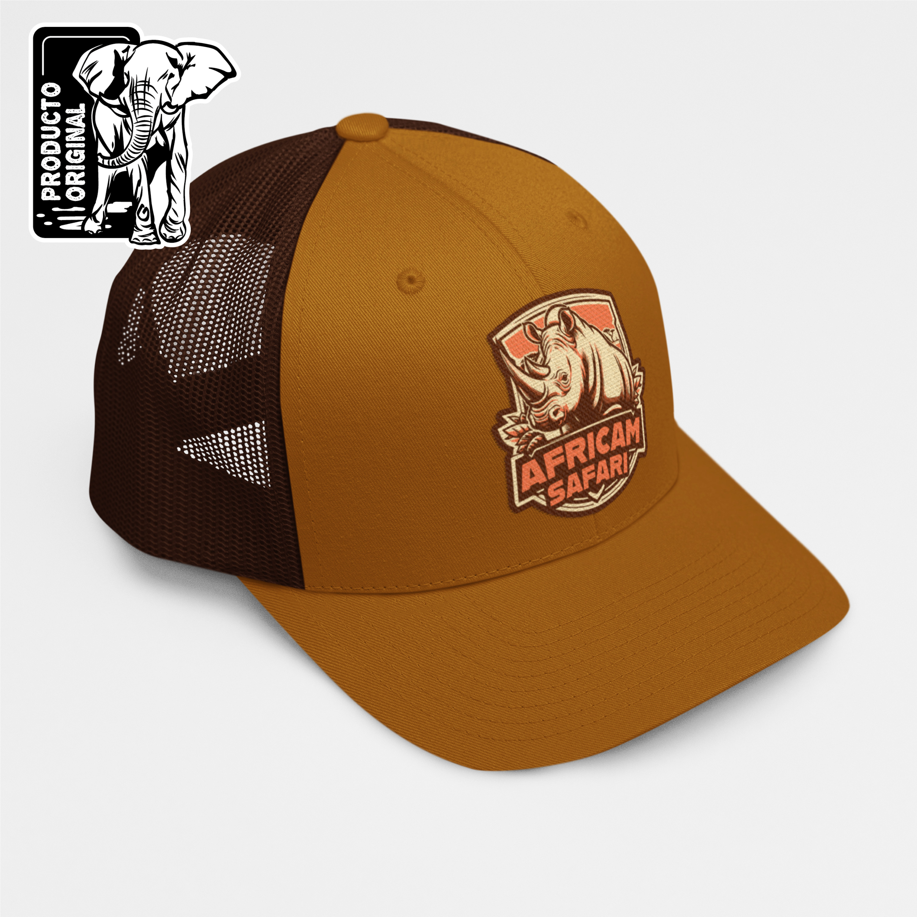 Diseño único. Nuestra gorra tipo trucker en color café, está adornada con un impresionante parche de rinoceronte. Perfecta para quienes buscan destacar con un look auténtico y lleno de carácter.