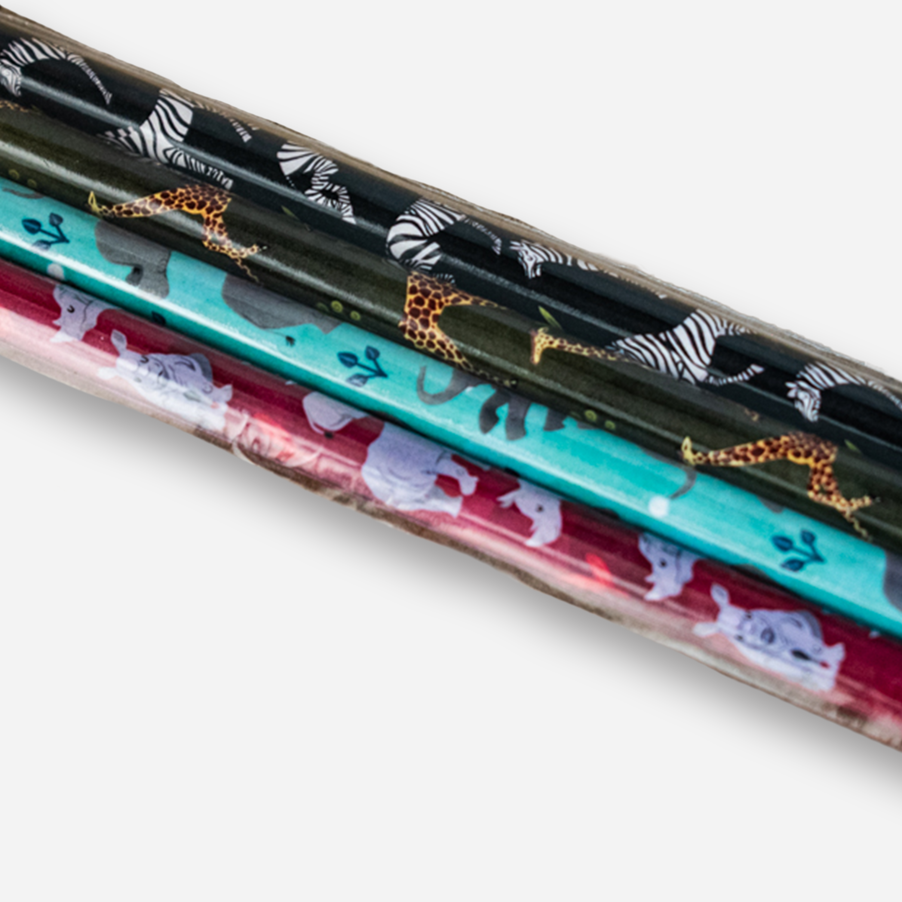 Diseños únicos. Elefantes, leones, jirafas y más. Cada lápiz está decorado con motivos que celebran la belleza de los animales y la naturaleza.
