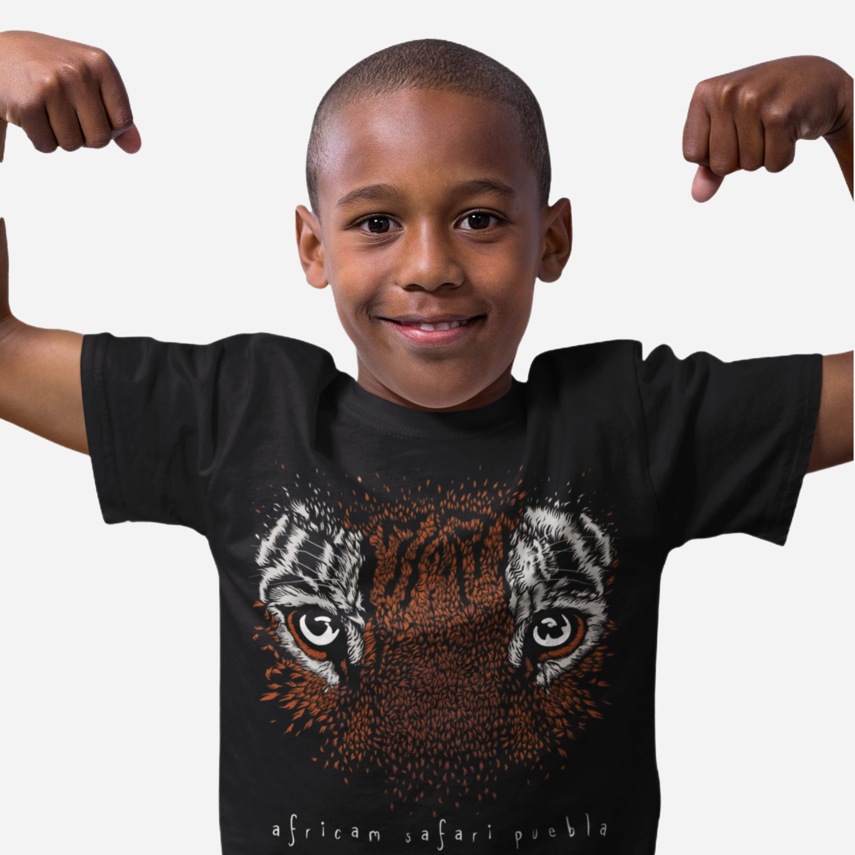 Diseño único. La mirada del tigre es un símbolo de ferocidad y valentía. Llevar esta camiseta le dará un aura de confianza y determinación, haciéndolo destacar en cualquier ocasión. Esta playera es perfecta para aquellos pequeños exploradores que buscan un toque de misterio y creatividad.