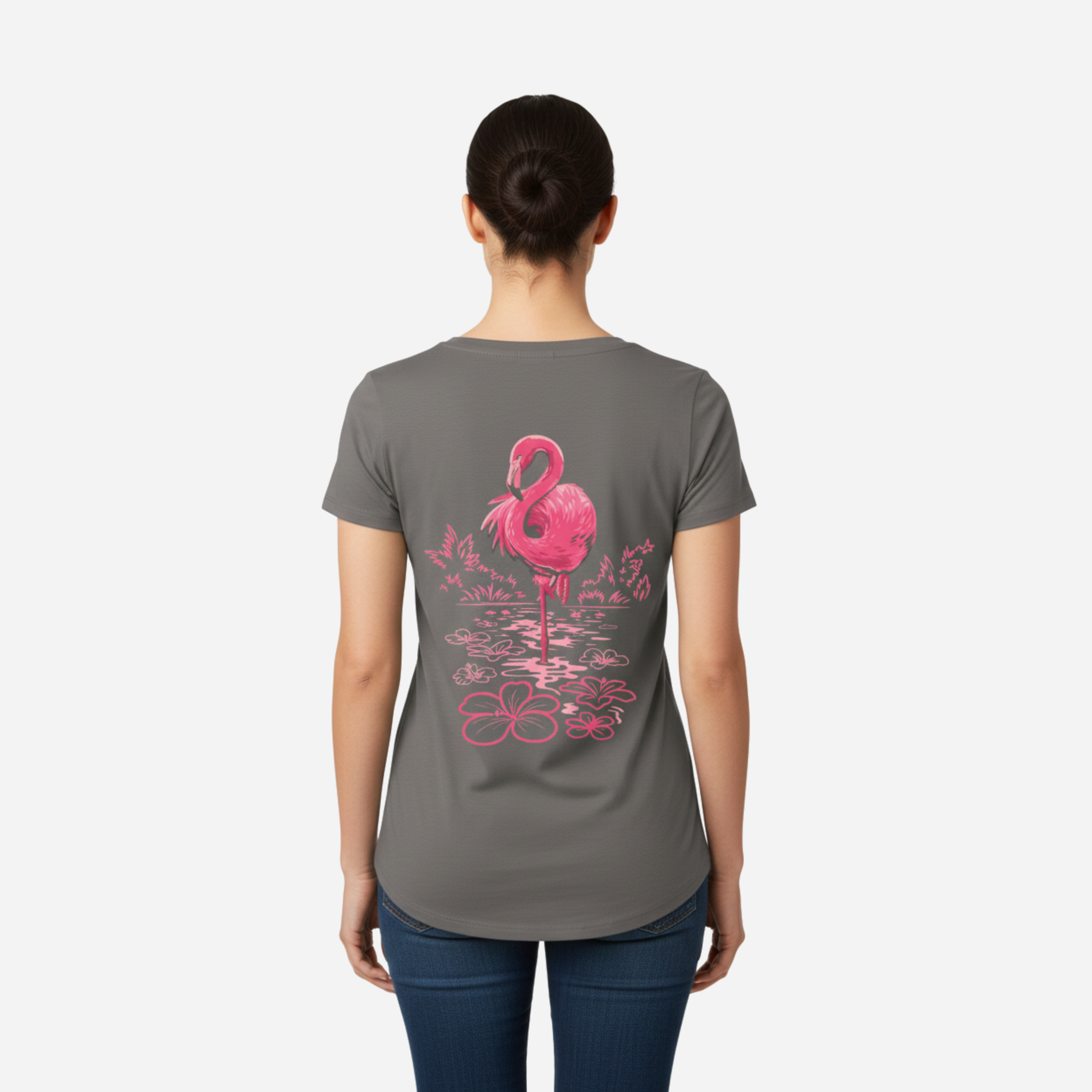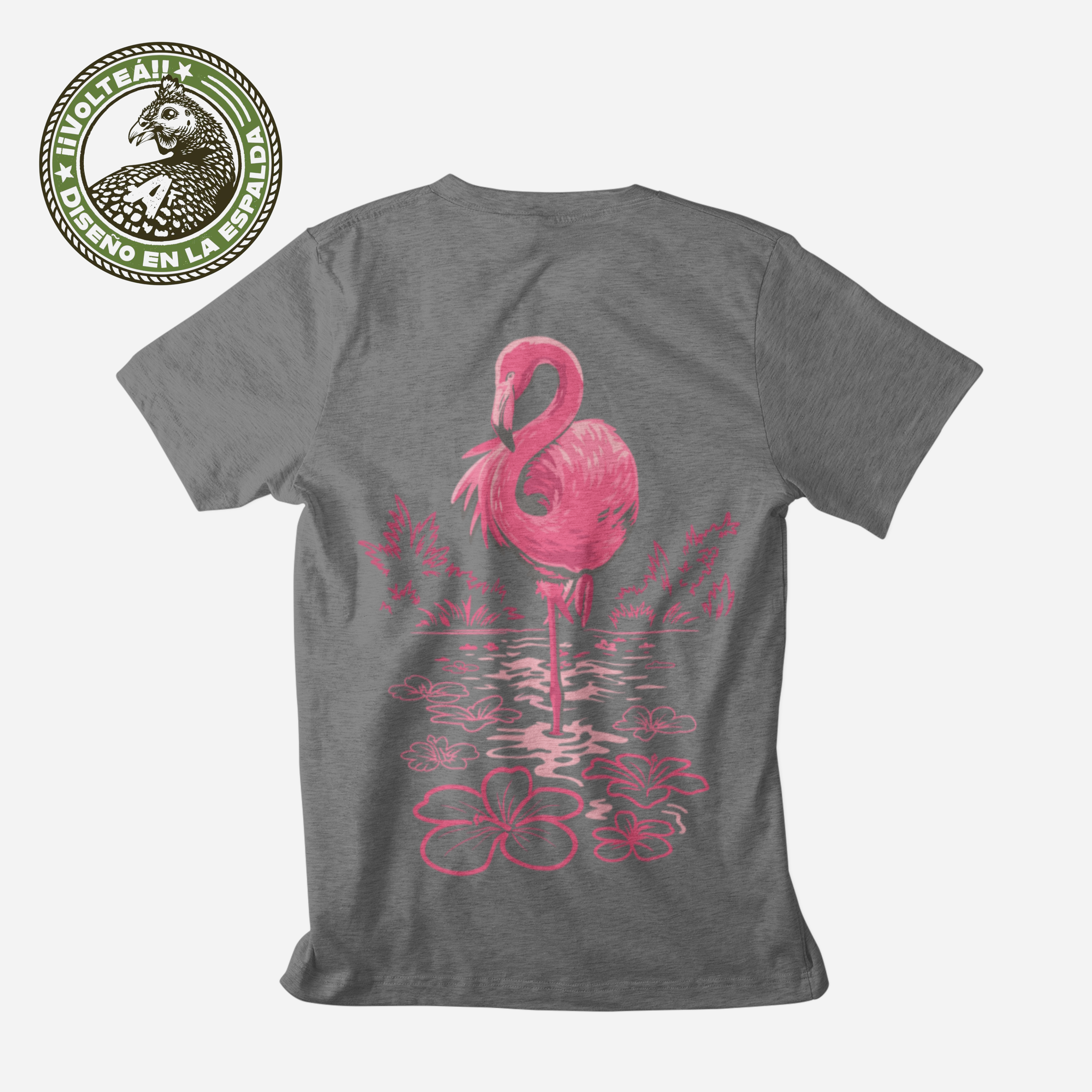 Diseño único. Una playera inspirada en la belleza y libertad de la naturaleza. En el frente luce un bordado elegante de Africam Safari, mientras que en la parte trasera destaca un flamenco serigrafiado que abarca toda la espalda, símbolo de vida, color y conservación.