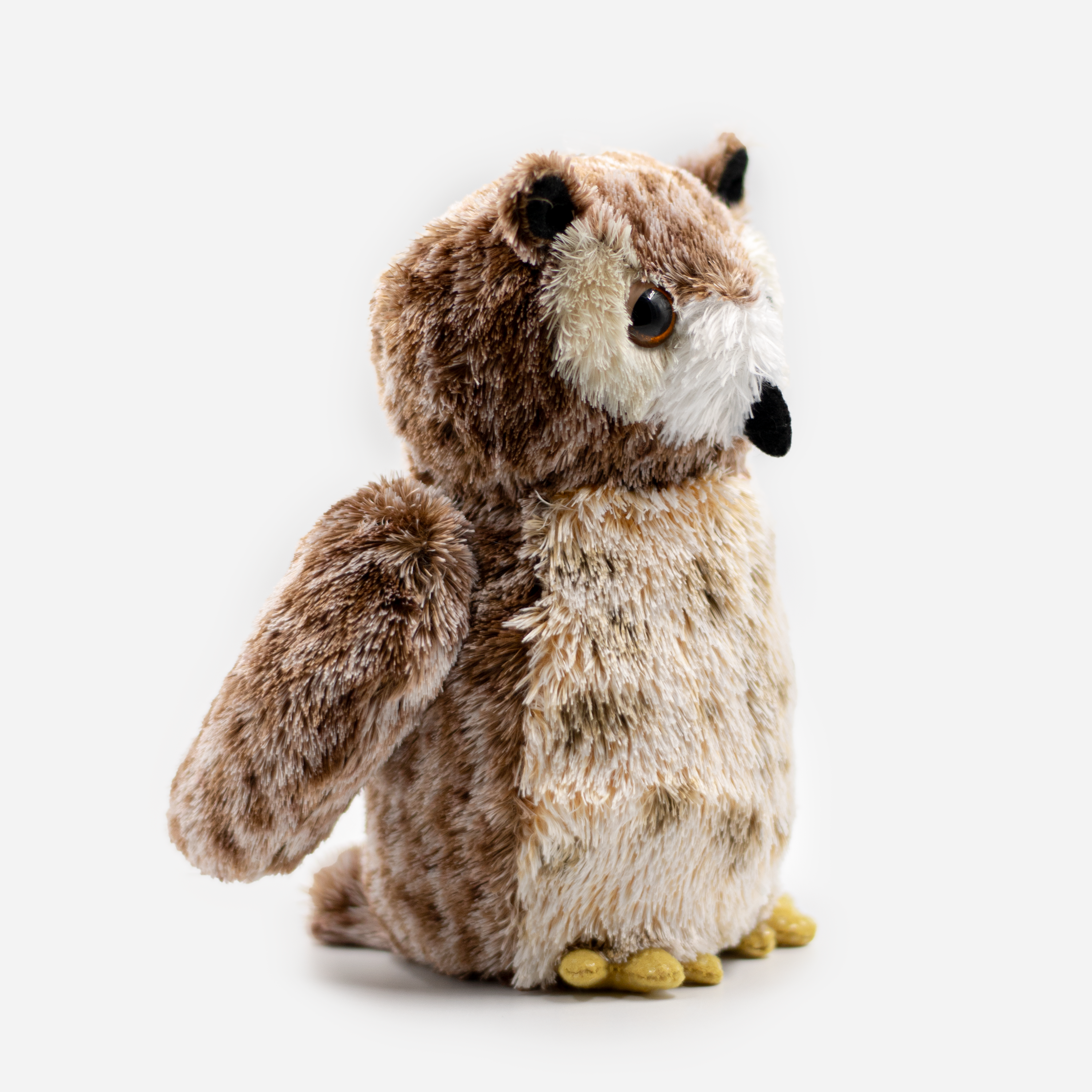 Diseño único. Este adorable búho cornudo es el compañero perfecto para tus momentos de calma y ternura. Con su plumaje en tonos marrones y blancos que imitan el realismo de un búho verdadero, además de sus intensos ojos naranja y su pequeño pico negro, cada detalle está pensado para cautivar.